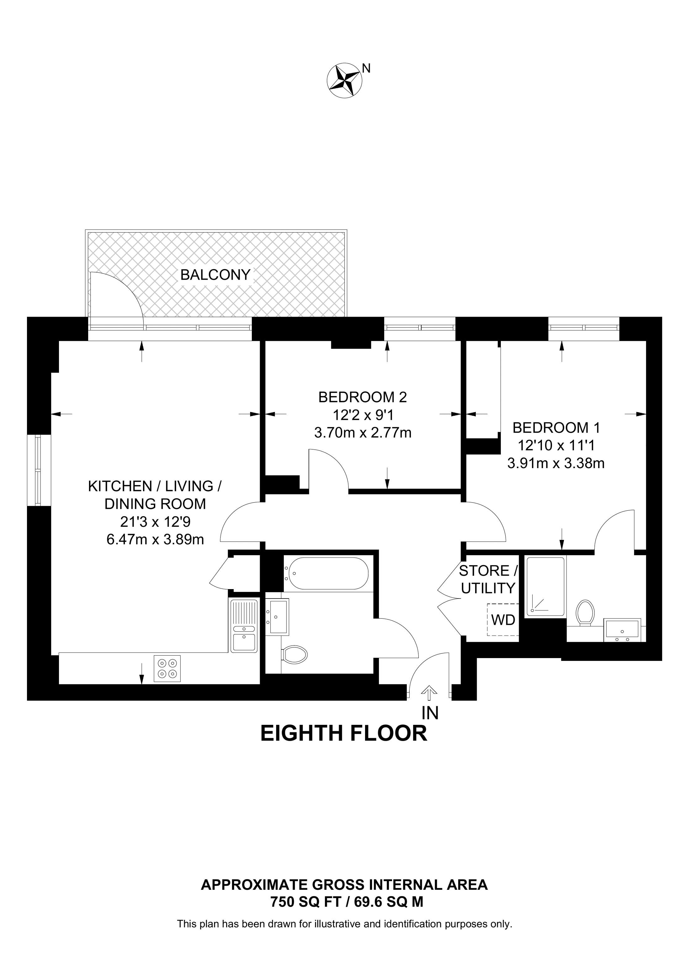 £690,000 North East aspect. 8th floor flat | 2 Beds | 754 Sq Ft70 Sq M | ||