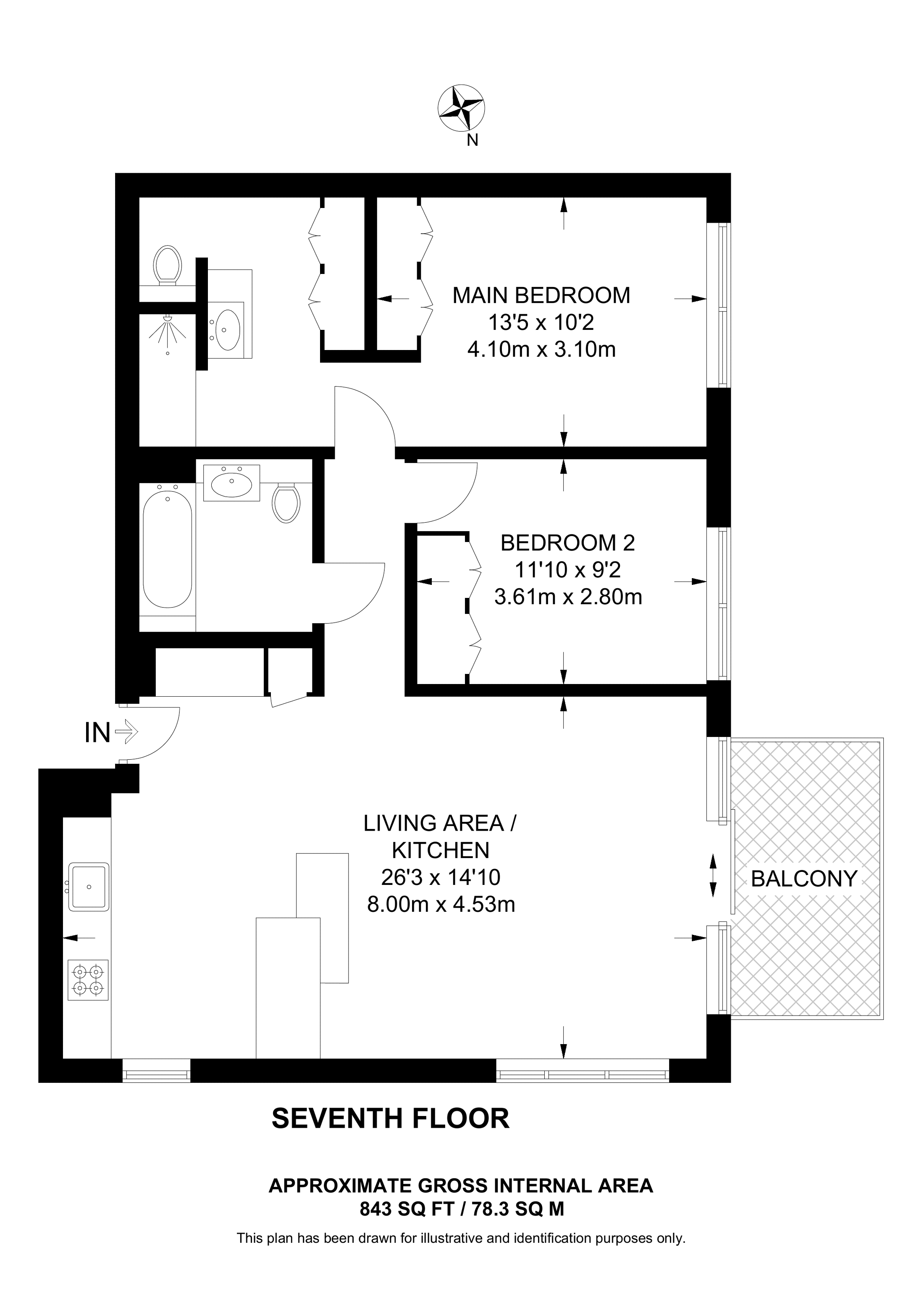 £701,500 North West aspect. 7th floor flat | 2 Beds | 843 Sq Ft78 Sq M | ||