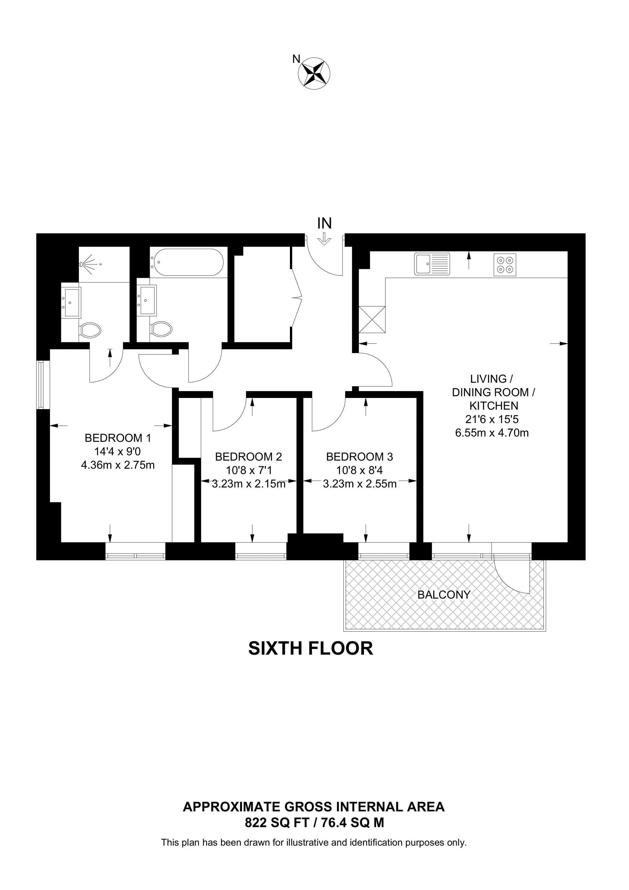 £567,000 West aspect. 6th floor flat | 3 Beds | 1,000 Sq Ft93 Sq M | ||